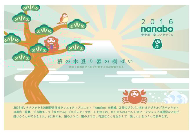 2016/01/01 今年も nanabo をよろしくお願いいたします。 2016年が幕を開けました。nanabo は2年目を迎えます。変わらず、私たちの得意なことを生かしてたくさんの「楽しい」を作り出して行かれるよう、「猿の木登り 蟹の横ばい」をモットーにして取り組んで参りたいと思います。 今年も、nanabo をどうぞよろしくお願いいたします。 tagPlaceholderカテゴリ: お知らせ, 2016