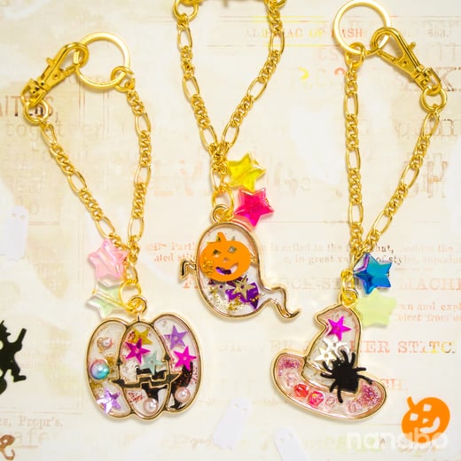 ハロウィンにちなんで、オバケ・カボチャ・魔女の帽子からモチーフをひとつ選び、レジンを使ったバッグチャームを作ります。 - 製作時間: