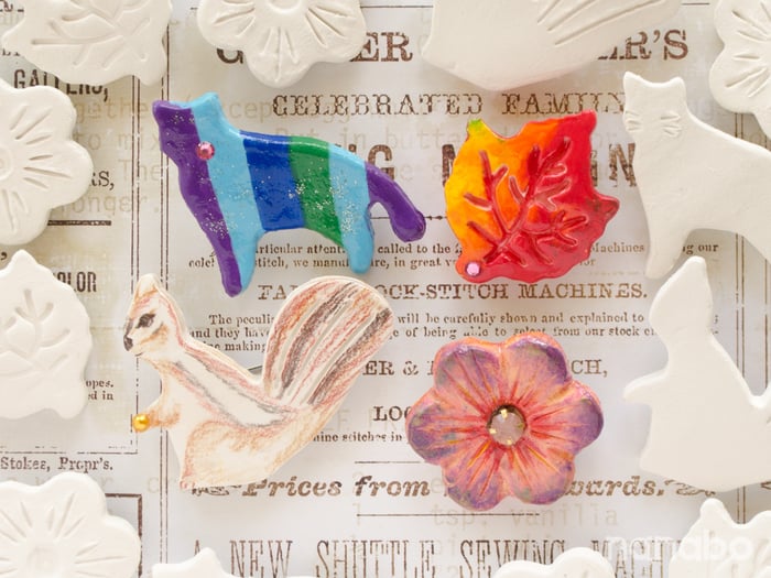 石を砕いて作られる、陶器のような質感の「石粉粘土」。あらかじめ、猫・リス・葉っぱ・お花の形を用意していますので、ひとつ選んで色づけをして、ニスを塗って、ビーズなどでデコレーションしたら完成! - 対象: