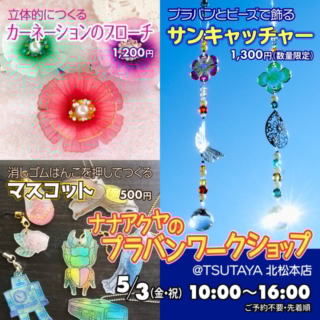 5月3日(金・祝)、長野県松本市「TSUTAYA北松本店」さんで、プラバンを使ってあれこれ作って楽しめる「ナナアクヤのプラバンワークショップ」を開催します!