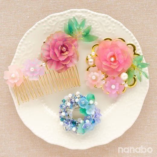 ヘアコーム(左)/バレッタ/ブローチ(右)の3種からひとつを選んで仕上げます。