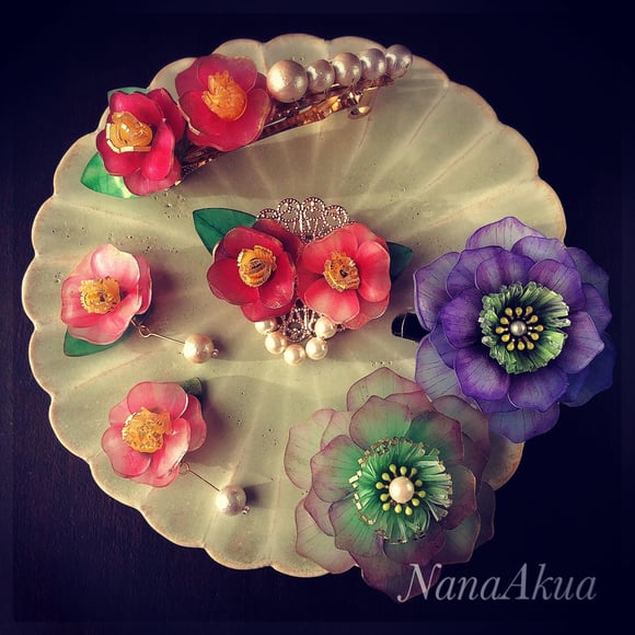 写真左上から中央にかけての“椿”モチーフの立体プラバン作品をつくり、ブローチやバレッタ、イヤリング/ピアス等を選んで仕上げます。