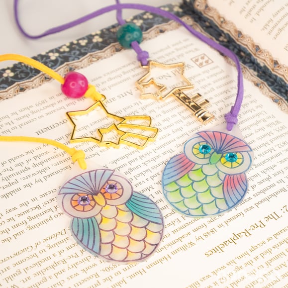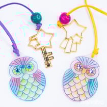 ふくろうの絵柄をあらかじめ描いてあるプラバンに、お好きな着色をし、金属パーツや革ひも、ウッドビーズなどと組み合わせてブックマーカー(しおり)を完成させます。 - 対象: