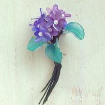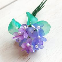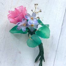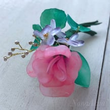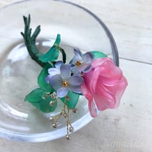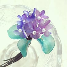 プラバンの花や葉を着色・成形してパーツを作り、ビーズ、ワイヤーなどでまとめてコサージュに仕上げます。“ミニバラ”と“スミレ”の組み合わせ(上の写真・左側)が基本ですが、お好みで“スミレ”のみ(同・右側)の仕立てにすることも可能です。