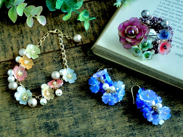 プラバンの小花と、たっぷり使い放題のビーズでアクセサリーを作ります。