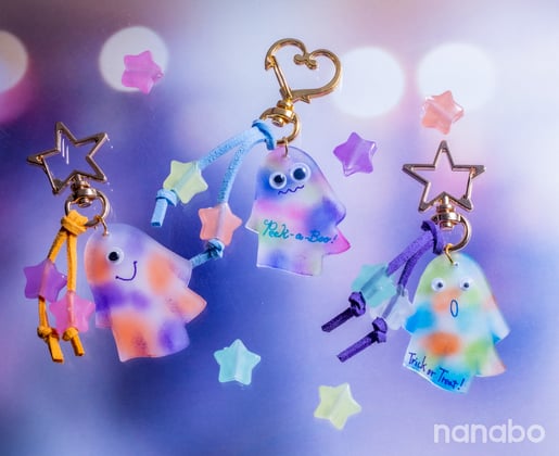 おばけの形にカット済のプラバンを使って、油性マーカーとキッチンペーパーでふんわり色付け。色を混ぜながら着色すると、さまざまな表情が出てきて楽しい! 目玉を付けて、おクチなどを描けば……、こわ~いはずのおばけもカラフルポップでかわいいマスコットに!
