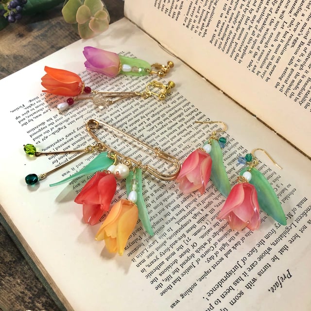 今回のポイントのひとつは、プラバンのグラデーション着色。ハイマッキーを使ってグラデーションを仕上げる方法をレクチャーします。さらにプラバンを立体的に仕上げたチューリップの花を作り、淡水パールなどと合わせてちょっとリッチなイヤリング/ピアス、ブローチを仕上げます。