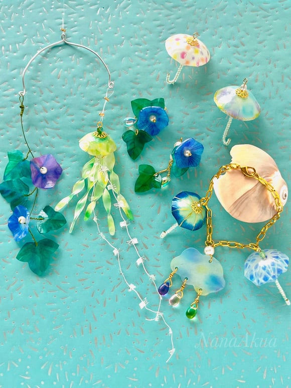 夏らしいモチーフを色々作ってモビールにしたり、バッグチャームやイヤリングなどのアクセサリーに仕立てることもできます。
