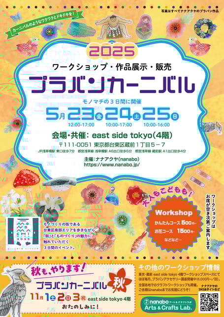 5月23日(金)からの週末は「プラバンカーニバル」! 台東区南部エリアのイベント「モノマチ2025」に合わせ、エリア内にある東京・蔵前「east side tokyo」さんで、今年もプラバンワークショップを中心としたイベントを開催します。毎年、子どもから大人まで大盛況! カーニバルのようなワクワクとドキドキをお届けします!